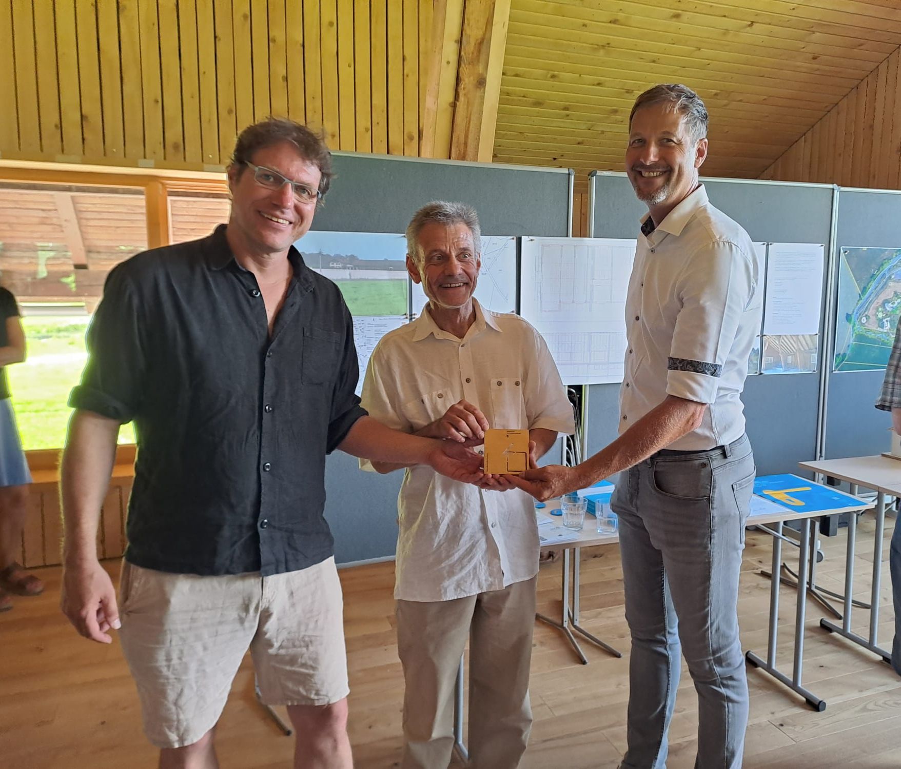Bild: Thomas Frey (NEZ Vorsitzender, links) und Christian Wilhelm (Bürgermeister Stadt Sonthofen, rechts) nehmen den Preis von Franz Schröck (Architekturforum Allgäu, mitte) entgegen.