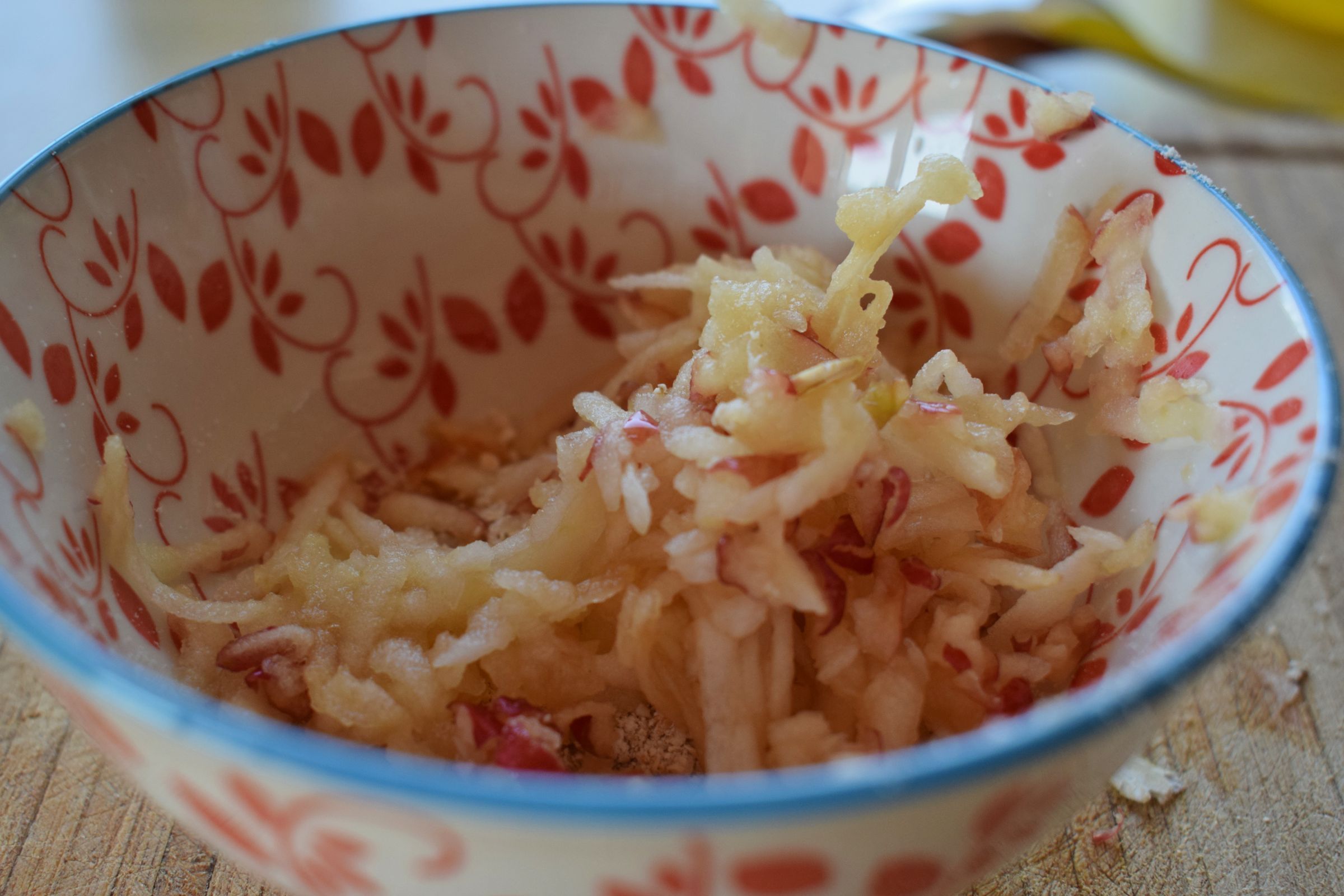 - Reibe den Apfel mit Schale mit einer feinen Reibe
