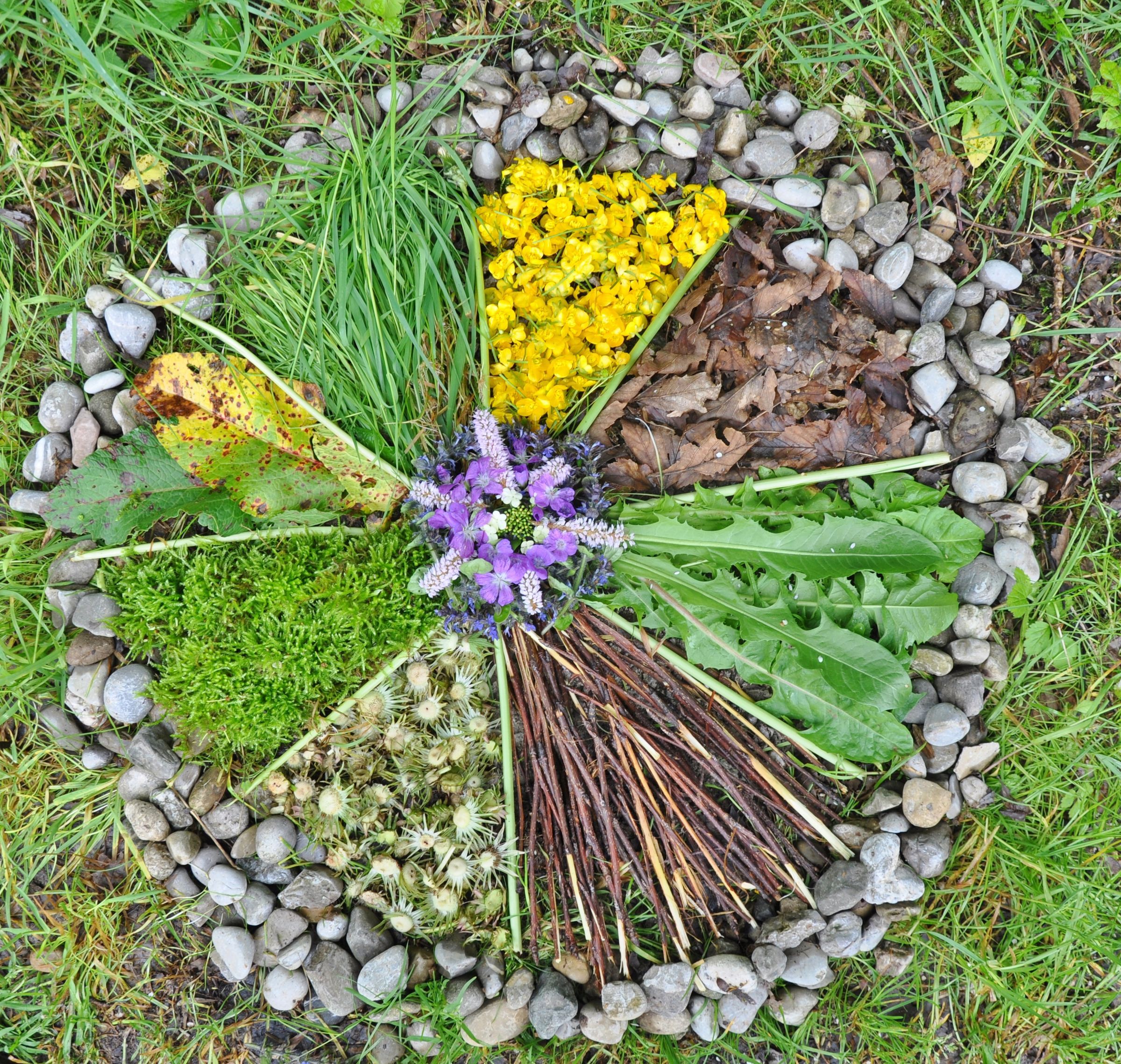 Schau dir einen Baum, eine Mulde im Boden oder ein Blatt an und überlege, was du aus den gestalten möchtest. Eine Blätterschlange aus Löwenzahn? Ein Zwergenhaus aus Fichtenzapfen? Ein bunter Blumenkreis? Der Fantasie sind keine Grenzen gesetzt! Schau doch mal in unsere Landart-Galerie weiter unten und sammle Inspiration...