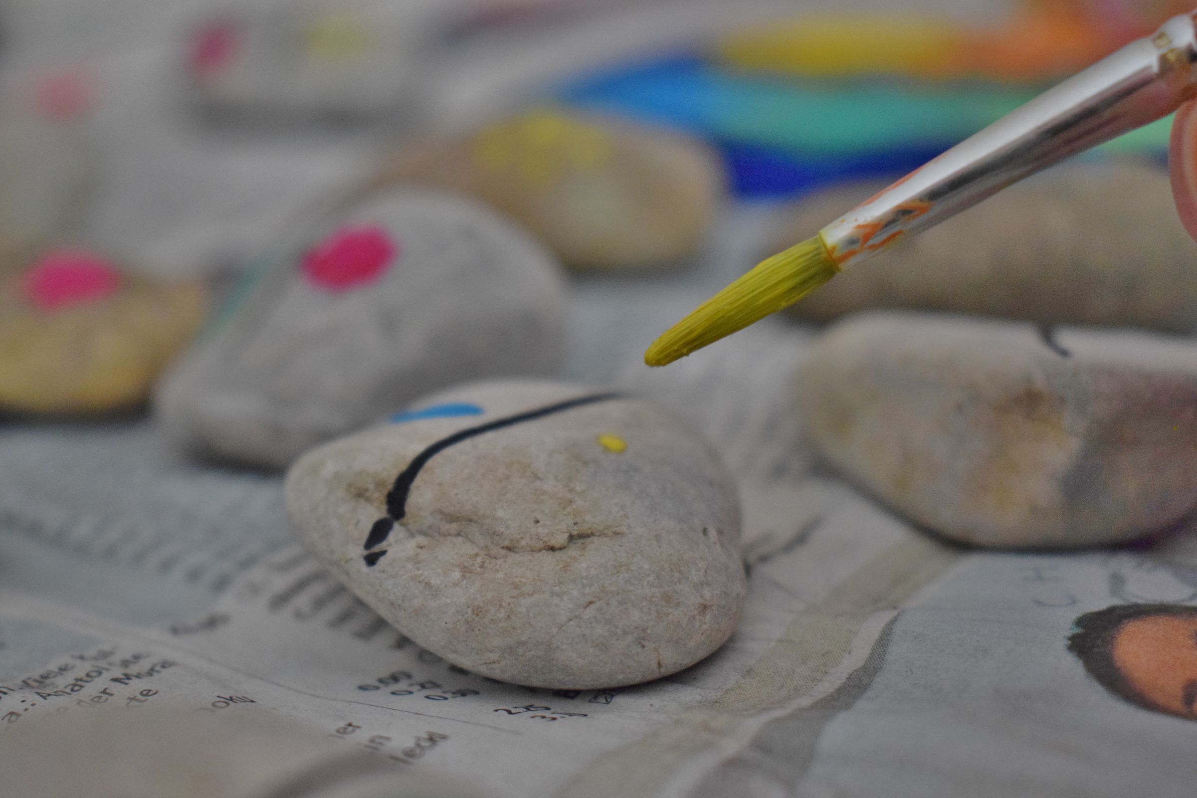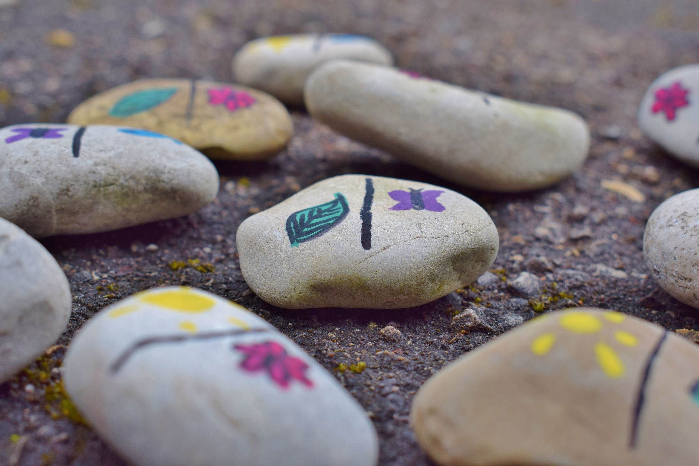 Als erstes wäscht du die Steine und lässt sie trocknen, damit die Farbe besser haftet. Dann malst du auf jeden Steine eine Trennlinie in die Mitte. Anschließend malst du mit den Wasserfarben (die Farbe mit möglichst wenig Wasser anrühren) kleine Bilder, wie zum Beispiel Blätter, Schmetterlinge, Blumen links und rechts neben die Linie. Auf jeden Stein kommen zwei verschiedene Bilder! Denk dir viele unterschiedliche Dinge aus, aber du solltest jedes Zeichen mindestens 2-mal auf verschiedene Steine aufmalen. Wenn du zufrieden bist, lässt du die Farbe noch etwas trocknen und schon ist dein Spiel fertig!
