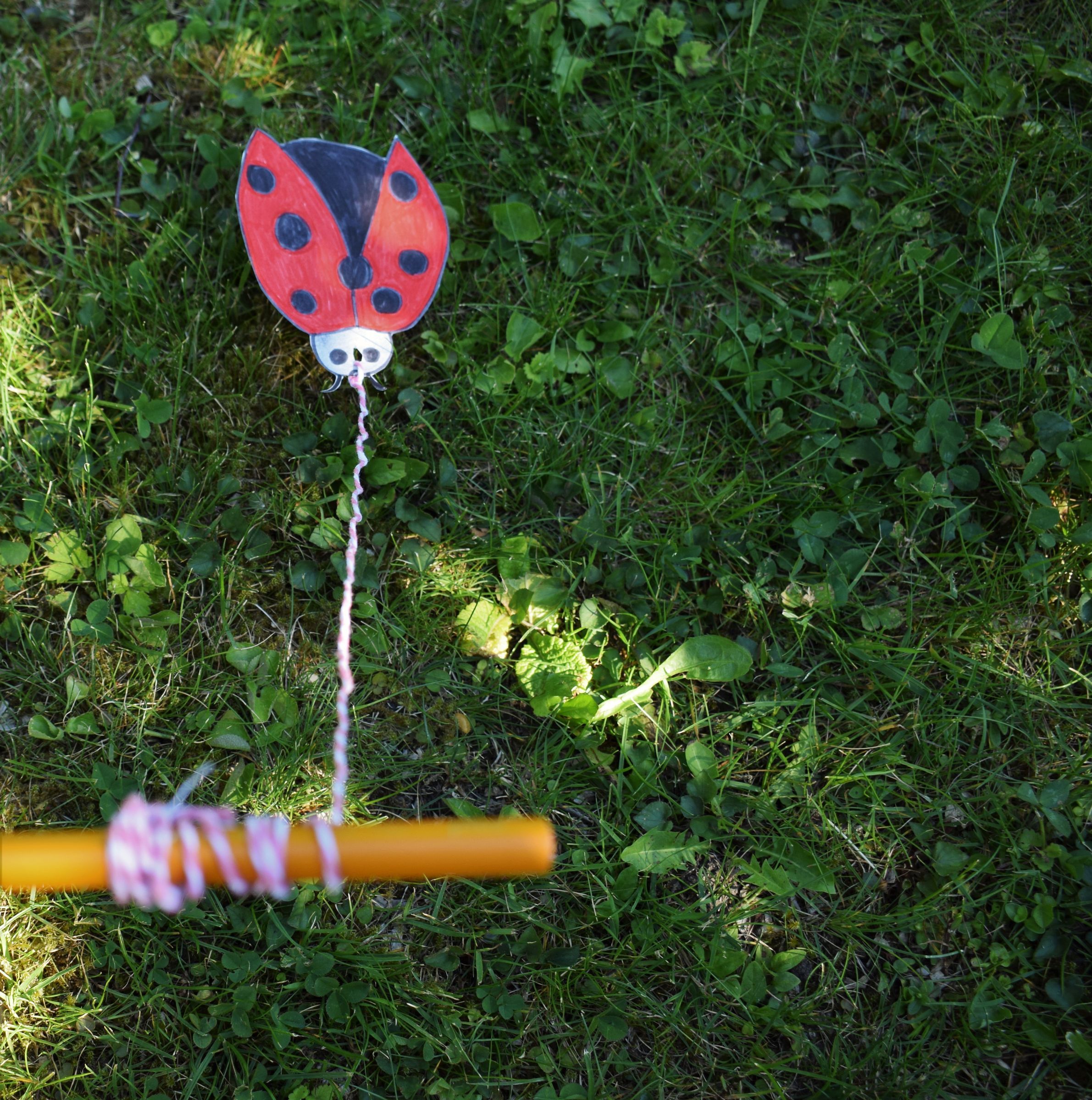 Zuerst bastelt jeder Spieler einen Marienkäfer aus Papier. Dazu kannst du entweder einen Marienkäfer malen oder unsere Vorlage benutzen. Dann schneidet jeder ein Stück Schnur (ungefähr 1 m) ab, das er um einen Stift knotet. Jetzt stanzt du ein Loch in den Kopf deines Käfers und knotest das andere Ende der Schnur an ihn. So spielt ihr: Auf das Startkommando wickelt ihr die Schnur auf den Stift auf. Gewonnen hat der Marienkäfer, der am schnellsten am Stift angekommen ist.